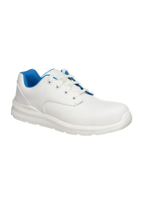 Introducing the Portwest Compositelite Laced Safety Shoe - the ultimate footwear for professionals in the food, pharmaceutical, catering, and hospitality industries. With its metal-free microfibre construction, this safety trainer offers a wipe-clean upper and an antimicrobial lining for maximum hygiene. The padded collar ensures all-day comfort, while the vegan-friendly design appeals to conscious consumers. Featuring a composite toecap and water-resistant upper, these shoes provide unbeatable protection against impacts and water penetration. The non-magnetic, anti-static design ensures safety in various environments, while the energy-absorbing seat region and fuel/oil resistant outsole offer additional peace of mind. With a slip-resistant outsole and CE certification, these shoes are the perfect choice for professionals who prioritize safety without compromising style. Get ready to step into a new level of comfort and protection with the Portwest Compositelite Laced Safety Shoe.
